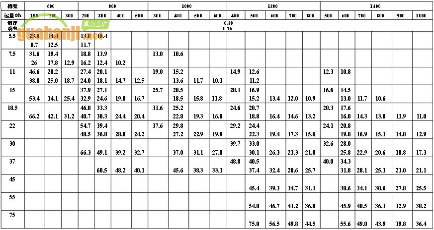 XGZ、MXGZ系列輕型刮板輸送機(jī)功率、長度選擇表
